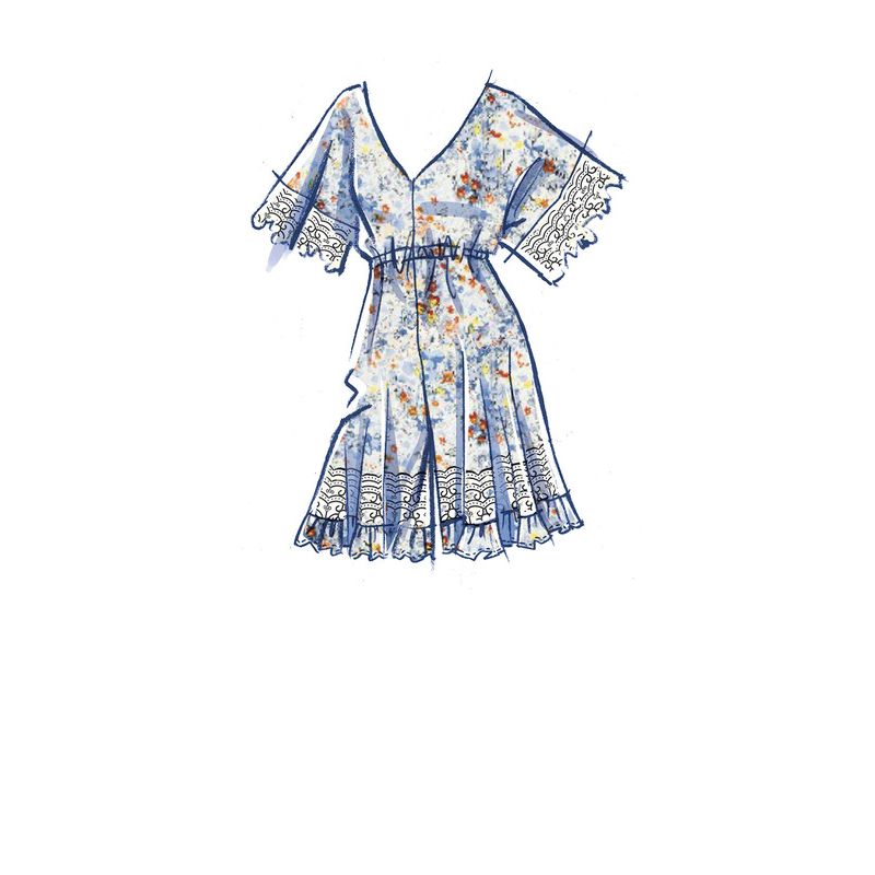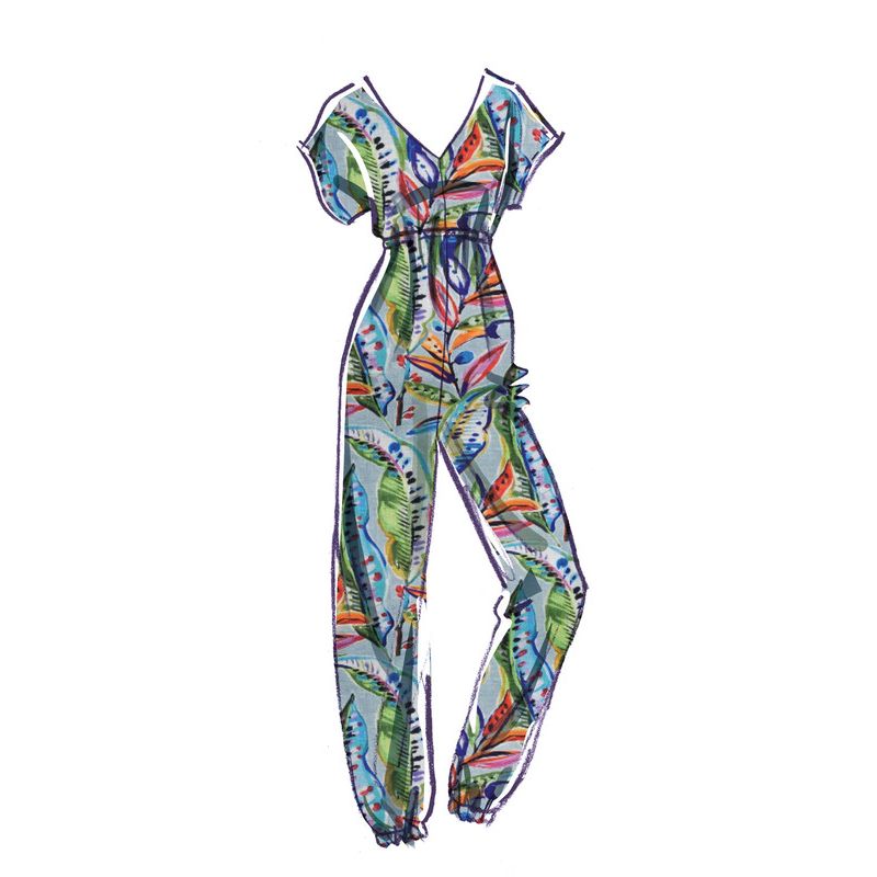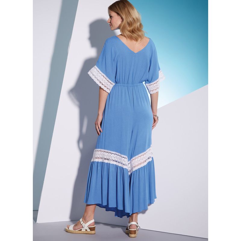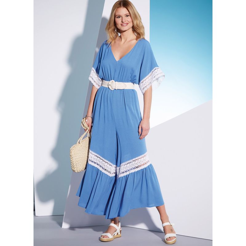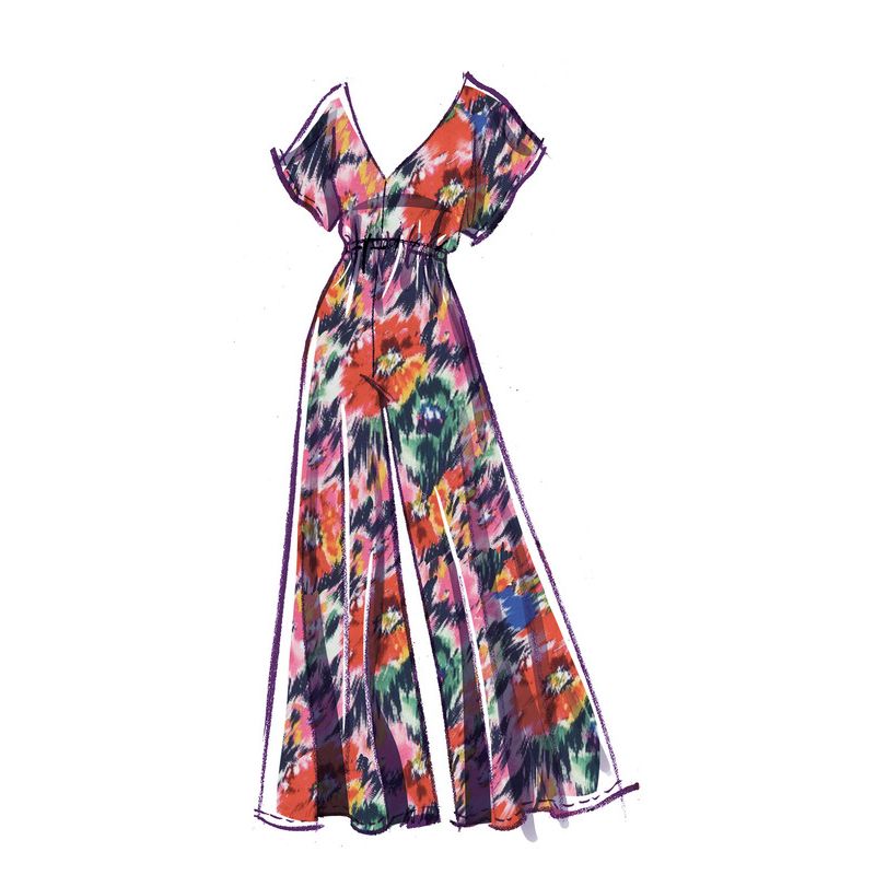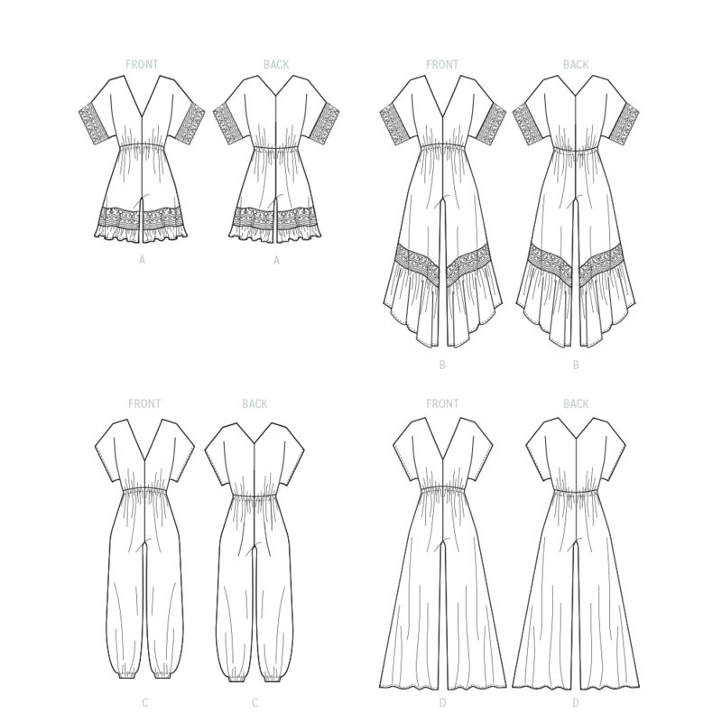 Le patron McCall's 8313 propose une collection de combishorts et combinaisons, avec une taille élastiquée, un décolleté en V et des manches dolman. Les modèles A et B se distinguent par leurs détails en dentelle et volants, tandis que le modèle C a un ourlet élastique pour une touche plus décontractée. Chaque variation offre un look polyvalent et moderne, idéal pour l'été ou pour un usage quotidien.