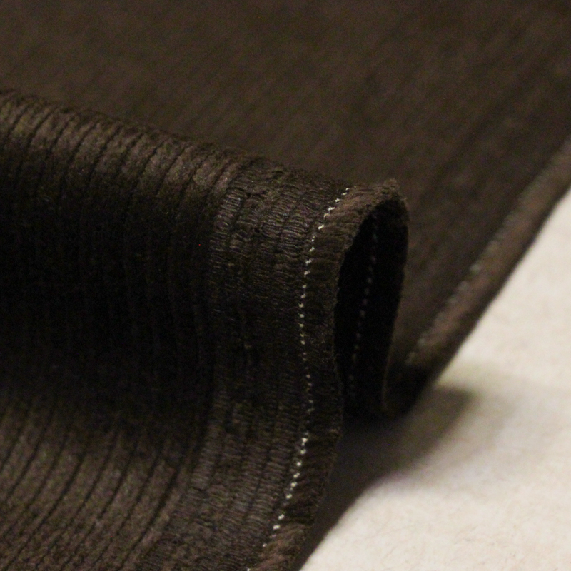 Avec ses côtes larges et distinctes, ce velours côtelé 300 raies marron tisse un lien subtil entre confort, élégance et engagement. Tissé en France à partir d’un mélange noble de coton et de lin certifiés BCI et OEKO-TEX, ce tissu est issu d’une source upcycling : il provient de fins de collections récupérées auprès de maisons de couture et d’ateliers textiles. Cela en fait un tissu à la fois responsable, rare et exclusif, proposé en quantité très limitée. La texture typique du velours 300 raies — plus marquée que celle des velours fins — donne du relief et du caractère à chaque pièce, tandis que le lin apporte une légère nervosité, renforçant la tenue du tissu sans sacrifier la souplesse du coton.