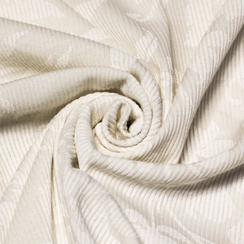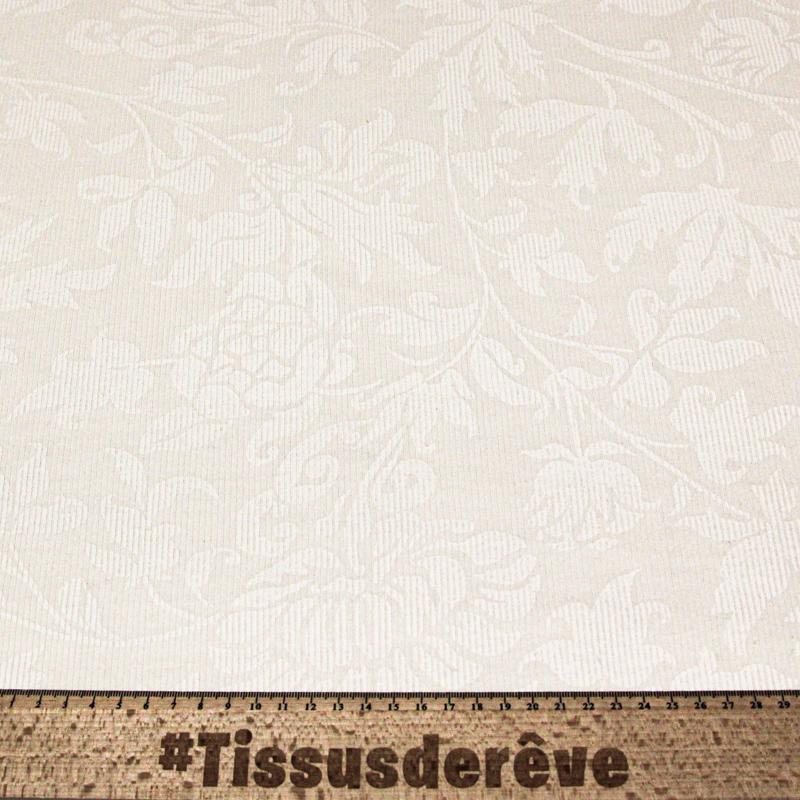 Raffinement et douceur s’unissent dans ce jersey côtelé 100% coton au motif floral ton sur ton. Travaillé dans une teinte blanc cassé, ce tissu présente un jeu subtil de reliefs grâce à une technique de tricotage en côtes combinée à un motif floral discret et élégant. Le dessin, délicatement imprimé dans la trame même du tissu, se dévoile à la lumière, révélant avec poésie des arabesques de feuillages et de fleurs stylisées dans un esprit presque jacquard, mais souple et confortable comme seul le jersey peut l’être.