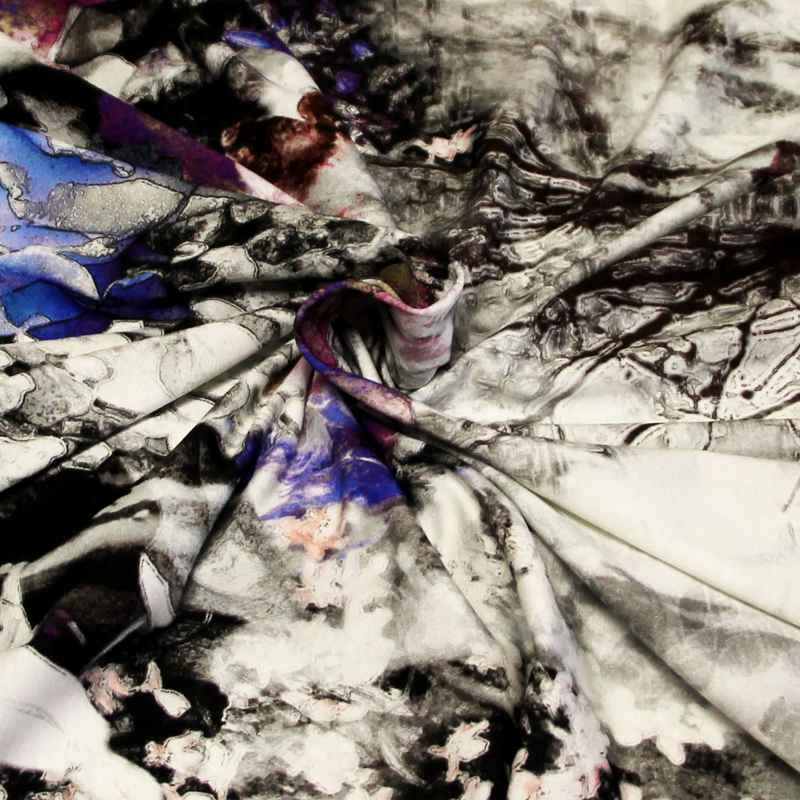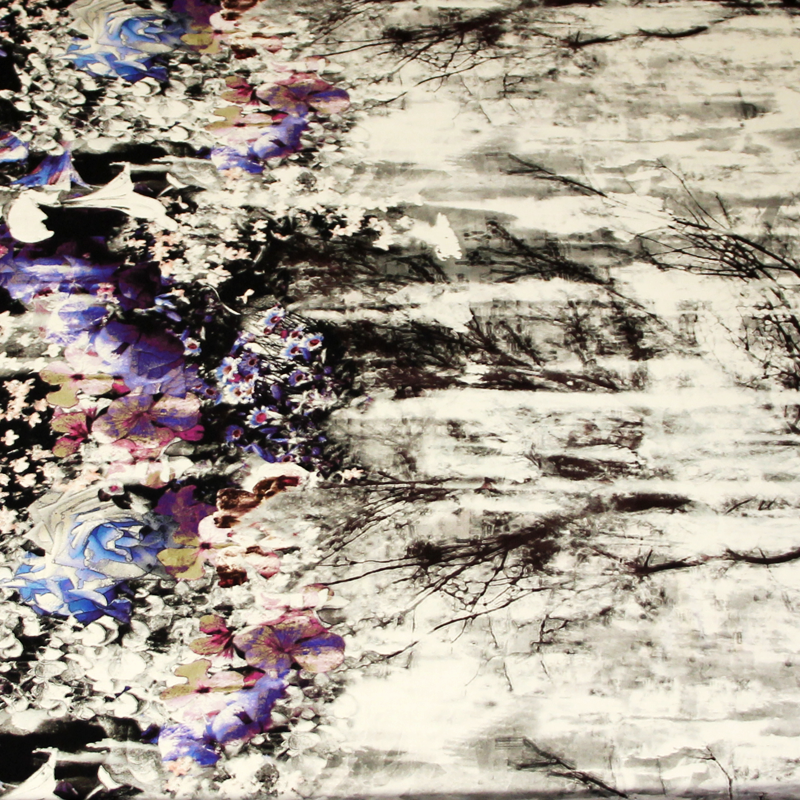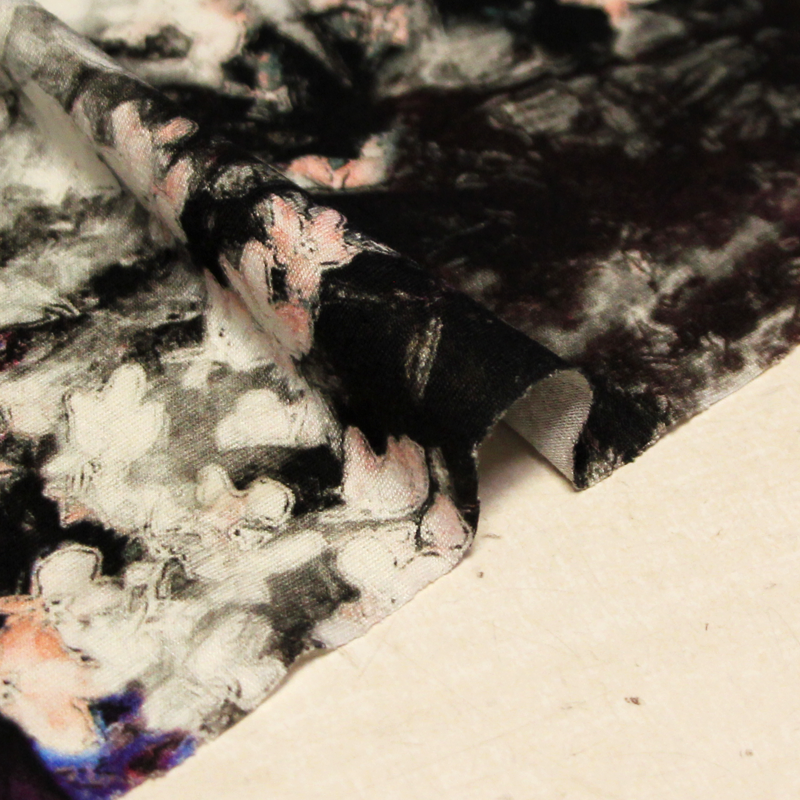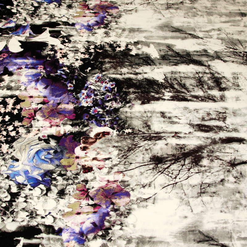 Ce jersey viscose & élasthanne est un tissu spectaculaire, à l'imprimé artistique et envoûtant, qui ne ressemble à aucun autre. Son motif évoque une forêt dénudée, presque fantomatique, rendue en nuances de noir, gris et blanc, parcourue latéralement par une base florale intense dans des tons bleu, violet, rose et parme. Ce contraste saisissant entre les éléments naturels décomposés et la vivacité florale crée une ambiance poétique et dramatique, parfaite pour des vêtements au style affirmé. Le motif est conçu en panneau de 1,15 m, ce qui permet d’orienter stratégiquement les fleurs sur vos créations : en bordure de robe, à la base d’un top, ou pour un effet asymétrique sur un pantalon ou une combi.