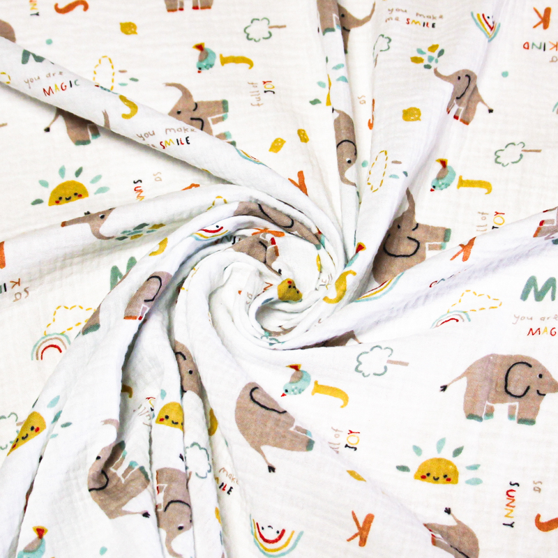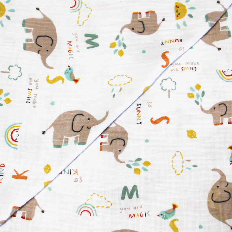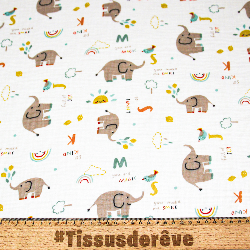 Ce tissu double gaze 100% coton, "Éléphants Magiques Fond Blanc", est une véritable merveille pour les projets de couture dédiés aux enfants ou à ceux qui recherchent un motif ludique et enchanteur. L'imprimé charmant met en scène de petits éléphants accompagnés de divers éléments amusants comme des arcs-en-ciel, des soleils souriants et des messages positifs tels que "you make me smile" et "you are magic". Les couleurs douces et pastel comme le beige, le vert menthe, le jaune et l'orange se détachent délicatement sur un fond blanc pur, créant une ambiance à la fois douce et joyeuse. La double gaze est une étoffe légère et respirante, composée de deux couches de gaze délicatement tissées ensemble. Cette construction unique lui confère une texture douce et moelleuse, idéale pour les créations nécessitant un tissu agréable à porter.