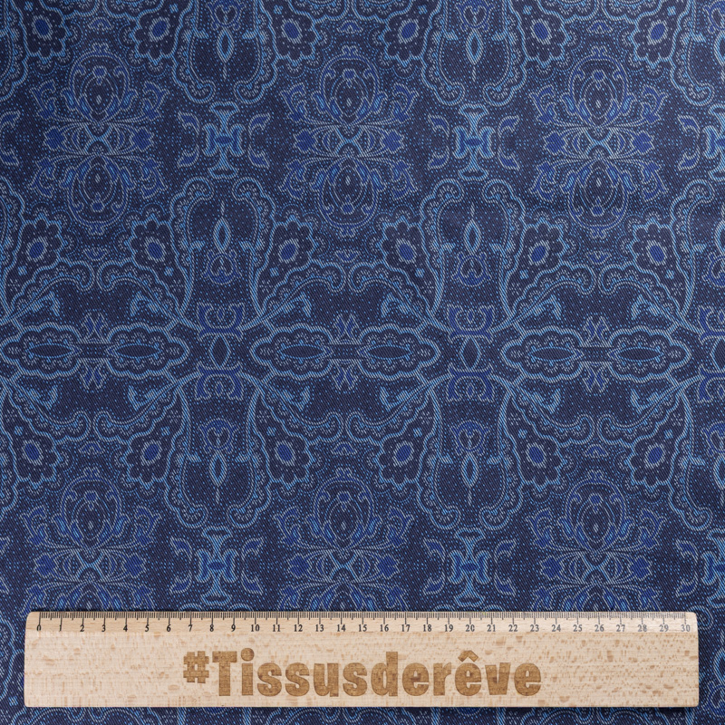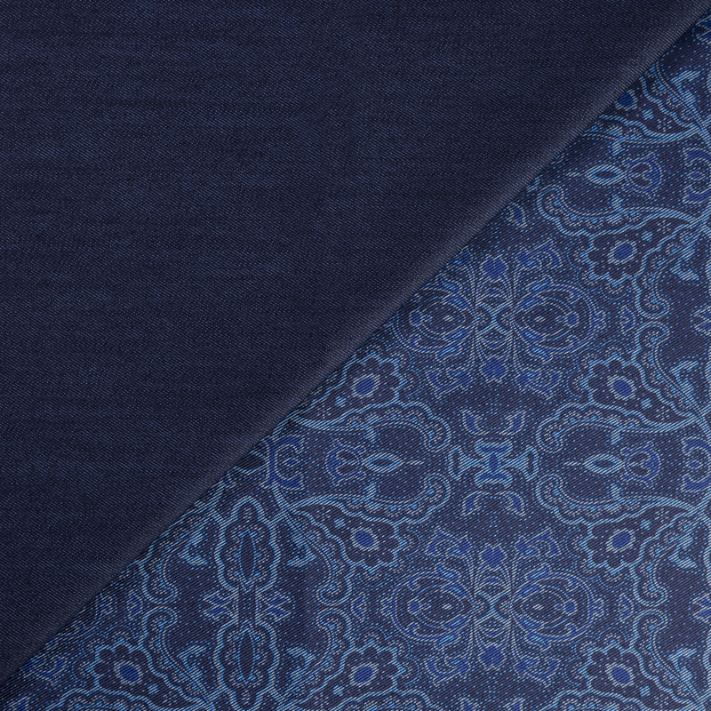 La richesse visuelle de ce jean’s se révèle dès le premier regard : un recto bleu foncé élégant et intemporel, et un envers orné d’un somptueux motif cachemire bleu qui apporte une dimension créative unique. Ce tissu associe la solidité du coton à la souplesse de l’élasthanne pour offrir une tenue confortable et agréable à coudre. Son tissage sergé, typique des denim de qualité, donne du caractère à la matière tout en lui permettant de s’adapter naturellement à la silhouette. Issu d’une démarche d’Upcycling, il valorise des stocks dormants italiens haut de gamme pour vous permettre de créer des pièces originales et responsables.