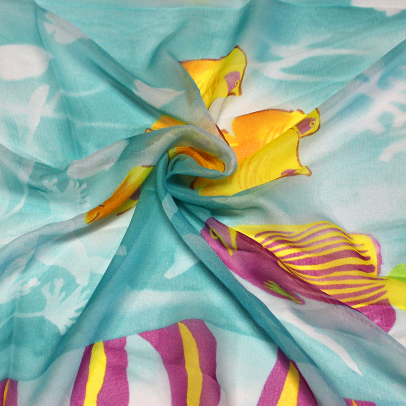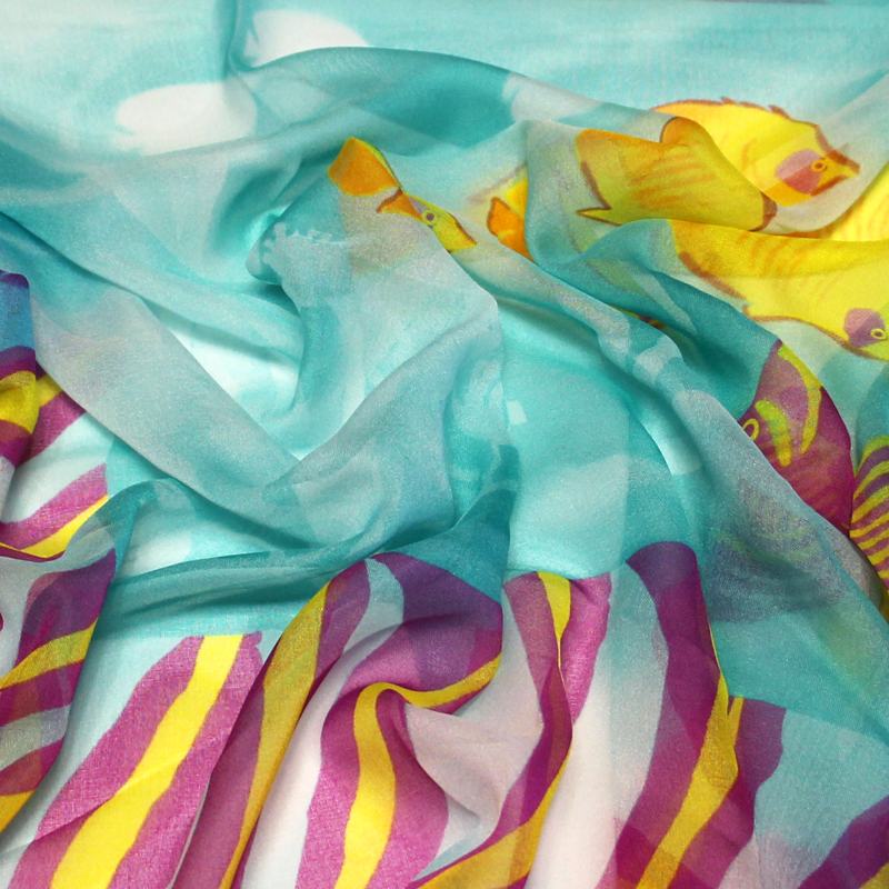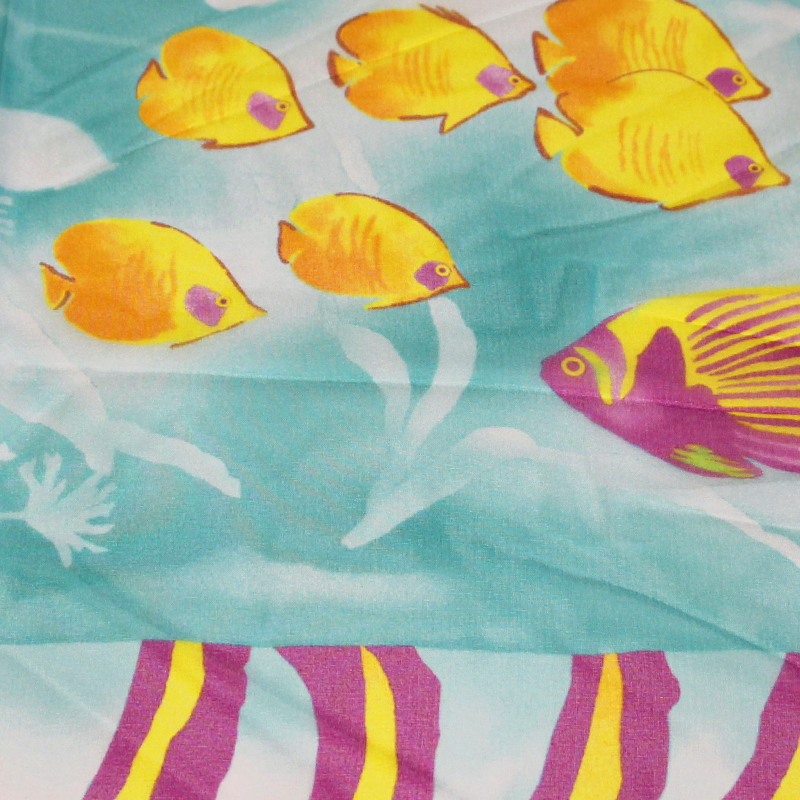 Il est doté d'un motif poisson de couleur jaune sur un fond bleu turquoise et fuchsia