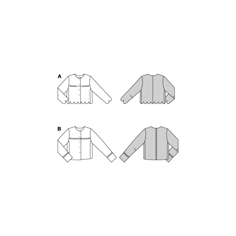 Ces vestes de coupe droite et sans col peuvent compléter diverses tenues. La version courte A mise sur des poches prises dans les coutures et des bords festonnés aux ourlets. Légèrement plus longue, la veste B est ornée de larges poignets et de coutures décoratives. Astuce : avec la jupe assortie (patron 5868), on obtient un tailleur chic.Lainage léger, fibres mélangées, tweed, boucletteAB : entoilage thermocollant. A : 4 boutons-pression à coudre. B : 5 boutons-pression à coudre
