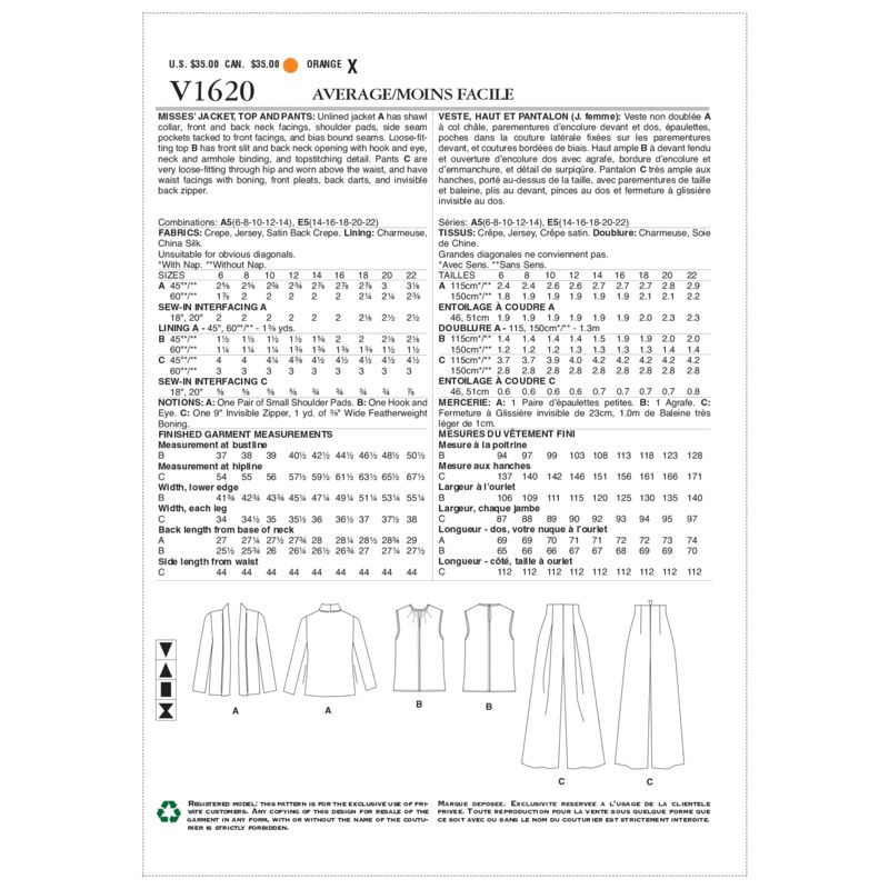 Patron Vogue 1620 A5 - Veste, haut et pantalon polyvalents