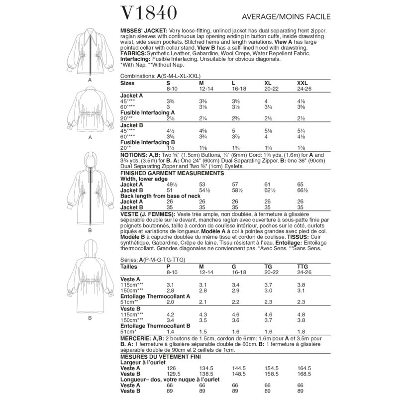 Patron Vogue 1840 A - Veste femme zippée à manches raglan et taille resserrée