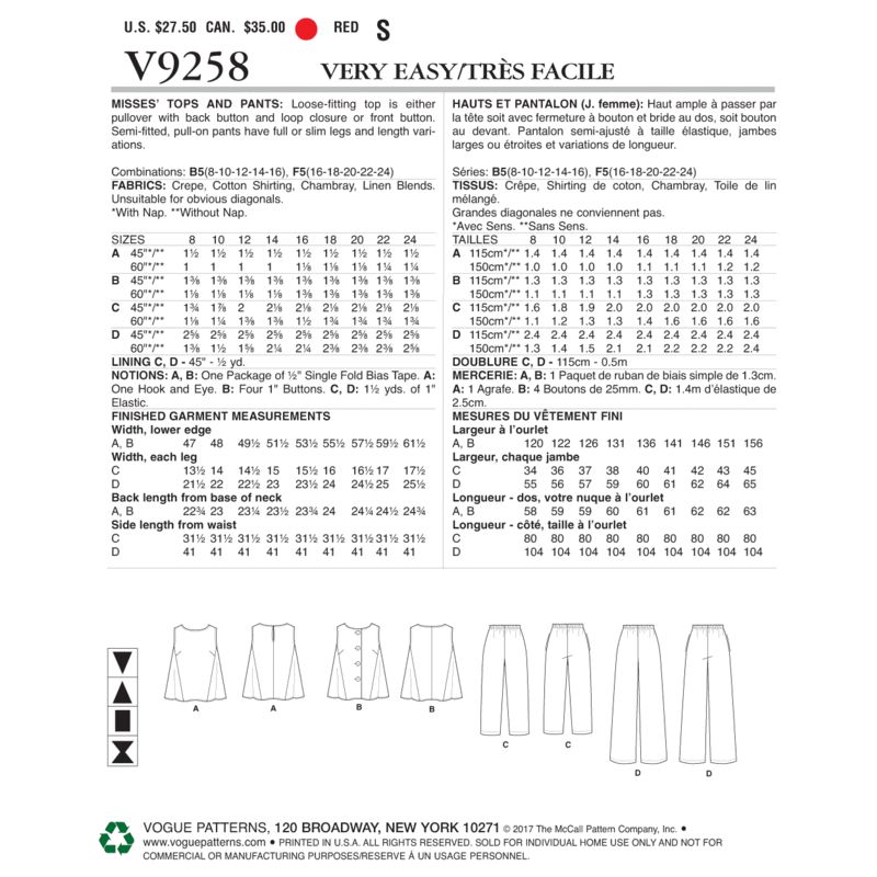 Patron Vogue 9258 F5 - Ensemble femme : Top, blouse et pantalon