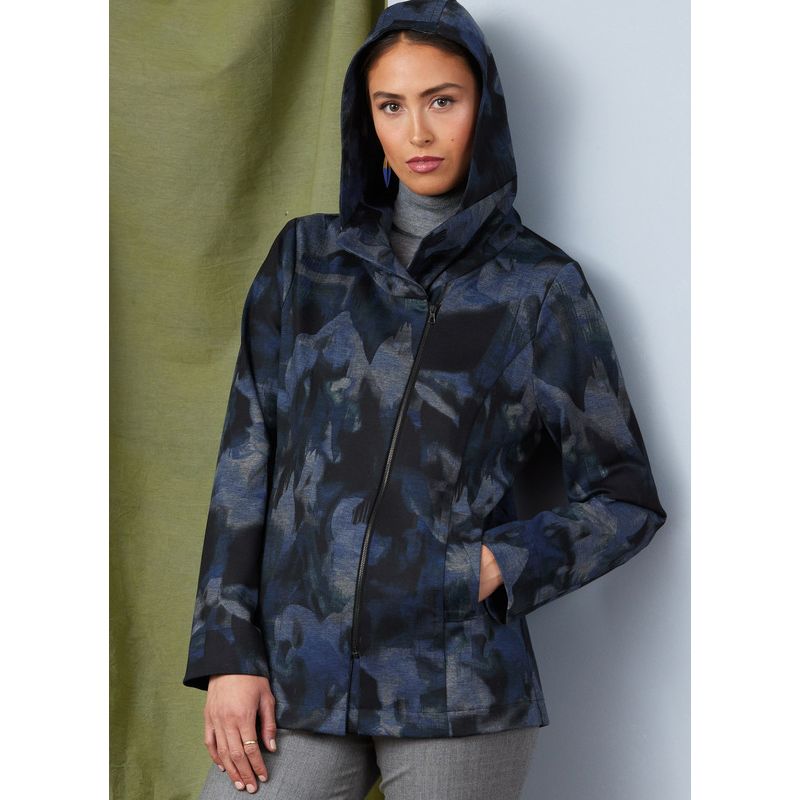 VESTE EN DEUX LONGUEURS (J. FEMMES)CAPTION: Veste semi-ajustée en deux longueurs avec devant asymétrique à fermeture à glissière séparable, découpe princesse, manches en deux pièces et doublure sur les poches passepoilées. Modèle B à capuche.TISSUS CONSEILLÉS: Tissus tissés extensibles tels que Denim, Twill, Tissus de poids pour veste avec élasticité, Tricots stables tels que Ponte, Scuba léger. Entoilage: Tricot thermocollant. Doublure: Tissu à doublure.