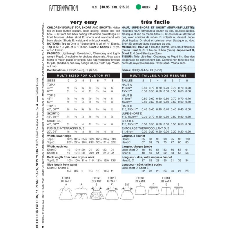 Le patron Butterick B4503 est un ensemble charmant pour enfants et petites filles, comprenant des tops sans manches, un skort et des shorts. Ce modèle offre diverses options pour créer un look estival et confortable pour les jeunes filles. Le haut à licou A présente une fermeture à bouton dans le dos, un dos élastique et un nœud décoratif. Les versions B et C sont dotées de lacets en ruban à l'avant et à l'arrière, avec des volants sur le devant pour la version B. Le skort A-line D combine des shorts avec une superposition de jupe et une ceinture élastique à l'arrière. Les shorts E sont également équipés d'une ceinture élastique à l'arrière.