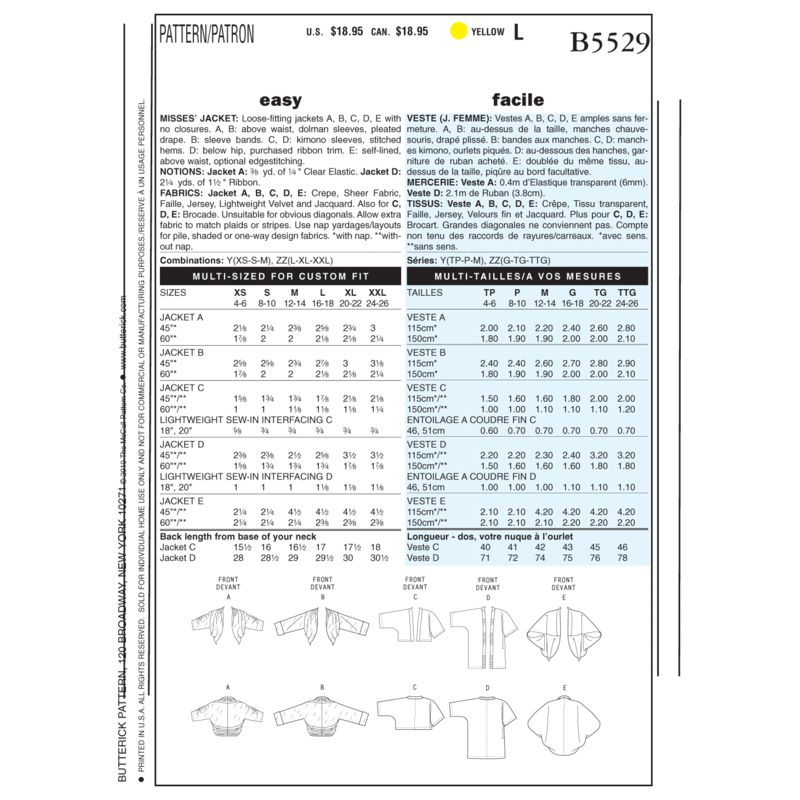 Le patron de couture Butterick 5529 propose une série de vestes amples et sans fermetures, parfaites pour les couturiers débutants à intermédiaires. Ce modèle inclut cinq styles différents de vestes (A, B, C, D, E) adaptées pour les tailles allant de XS à XXL. Les modèles A et B sont conçus pour s'arrêter au-dessus de la taille, avec des manches dolman et un drapé plissé. Le modèle B dispose également de bandes de manches. Les modèles C et D ont des manches kimono avec des ourlets cousus, et le modèle D tombe en dessous de la hanche et est orné d'un ruban acheté. Le modèle E est auto-doublé, se termine au-dessus de la taille et peut être fini avec un surpiqûre optionnel.