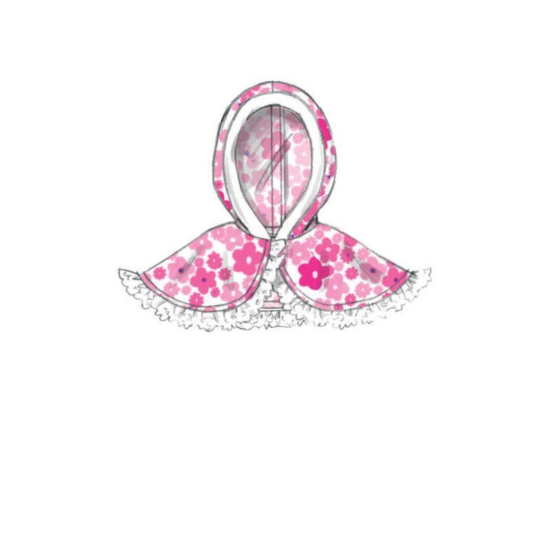 Le patron Butterick 6372 est idéal pour créer une adorable garde-robe pour bébés, comprenant une cape, un gilet, des nid d'anges et un pantalon. La cape possède une capuche avec une bande contrastante, une fermeture à pression, et une bordure en dentelle pré-froncée. Le gilet se ferme par une glissière à l'avant et présente un biais acheté sur les emmanchures. Le nid d'ange offre également une fermeture à glissière à l'avant, tandis que les versions C et D du patron sont dotées d'une capuche avec des oreilles. Le pantalon est facile à enfiler grâce à une taille élastiquée.