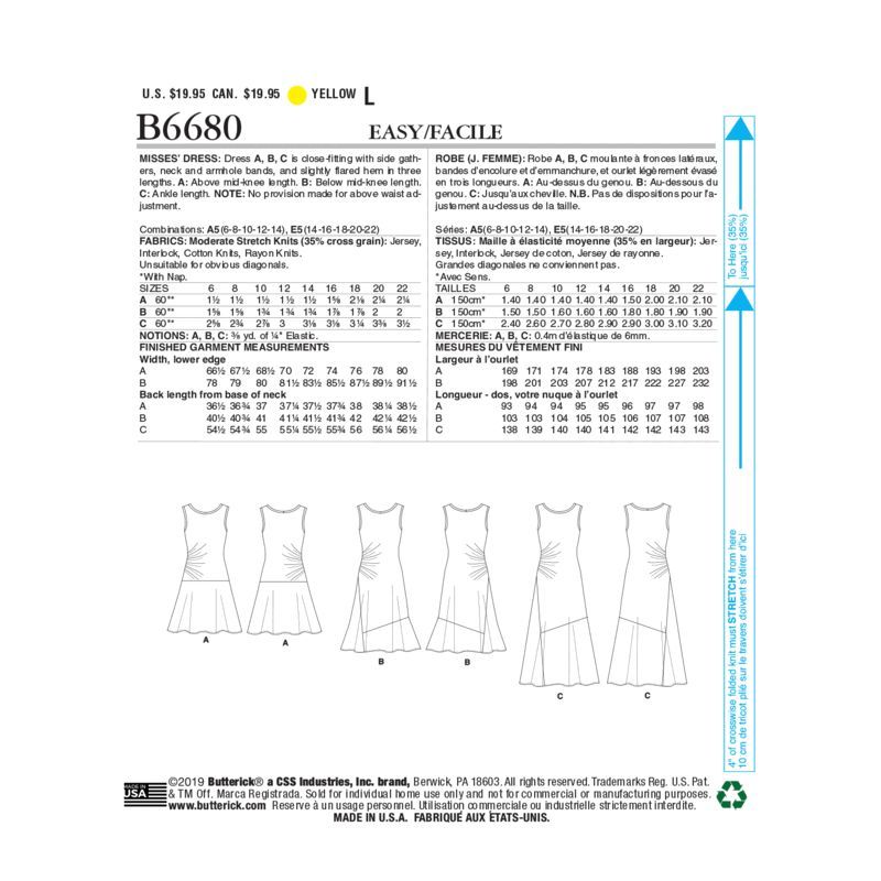 e patron Butterick 6680 est une création charmante pour celles qui recherchent une robe ajustée et féminine. Ce modèle propose trois variantes de longueur, offrant une polyvalence pour différents styles et occasions. La robe est conçue pour être près du corps, avec des fronces sur les côtés, ajoutant une touche de sophistication à la silhouette. Les bandes de finition au niveau du cou et des emmanchures apportent un détail raffiné et soigné.