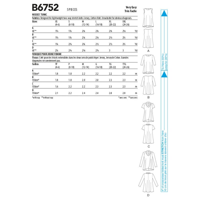 Le patron de couture Butterick B6752 est conçu pour la création de tuniques ajustées et évasées en tricot. Ce modèle polyvalent présente plusieurs variations à l'avant, une ourlet haut-bas, et un ourlet étroit. Une caractéristique intéressante est que le côté envers du tissu est visible sur l'ourlet arrière, ajoutant une touche distinctive au design. Le modèle offre des options de manches variées, y compris sans manches, manches trois-quarts, manches courtes, et manches longues. De plus, certaines versions incluent un col cheminée et un ourlet superposé en forme de tulipe, offrant une allure moderne et stylée.