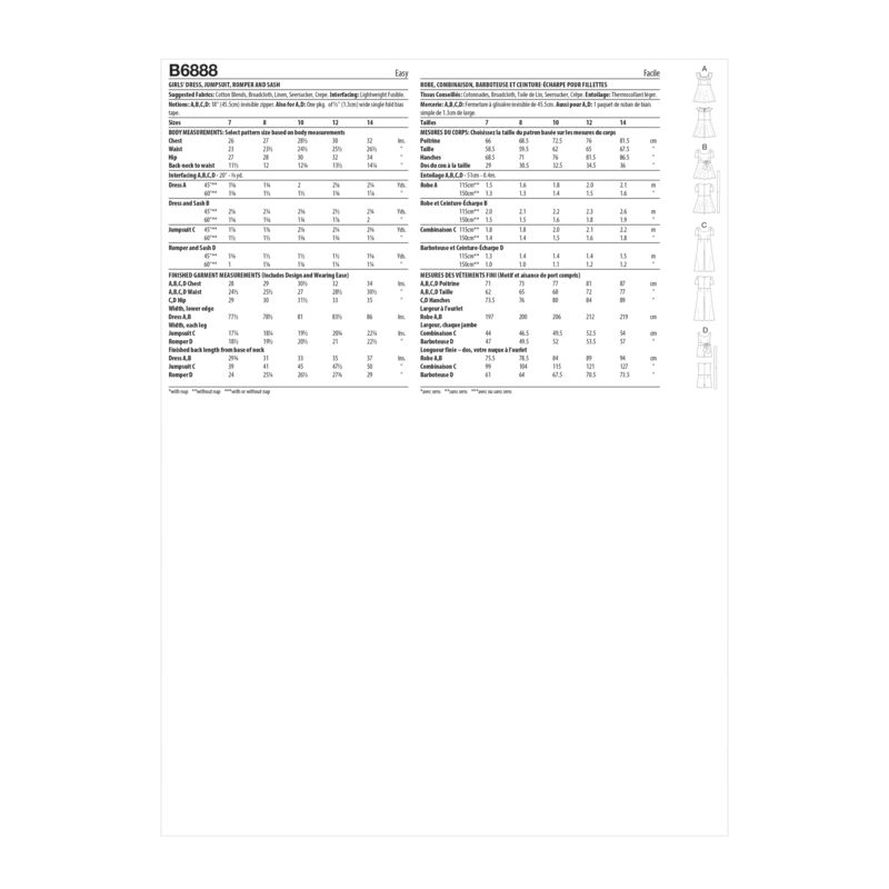 Le patron Butterick 6888 est un modèle polyvalent et charmant pour filles, offrant plusieurs options de vêtements dans un seul patron. Il comprend une robe avec une encolure en cœur, qui peut être confectionnée avec ou sans volant. La robe est dotée d'une jupe ample et évasée et propose différentes variations de manches. Le patron inclut également un combi-pantalon à jambes larges et à manches courtes froncées, ainsi qu'une combinaison sans manches avec une ceinture. Ce modèle est idéal pour créer des tenues élégantes et confortables, parfaites pour diverses occasions.