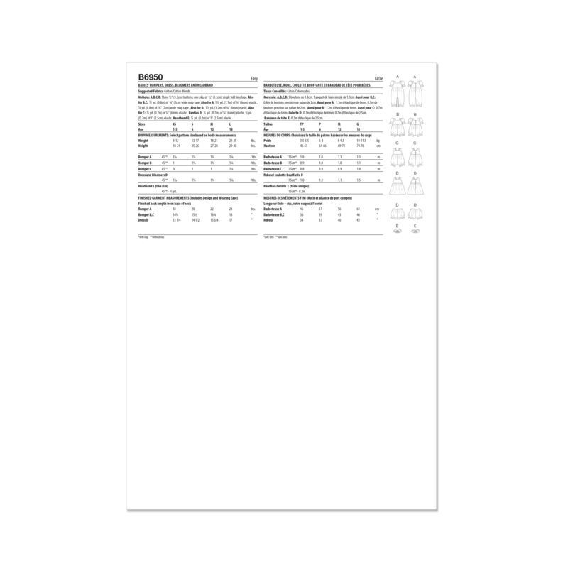 Le patron de couture Butterick 6950 est conçu spécialement pour les tout-petits, offrant une gamme adorable de rompers, une robe, des bloomers et un bandeau. Ce patron propose des rompers en deux longueurs, avec des options manches longues ou sans manches, qui se ferment à l'arrière avec des boutons et possèdent des pressions à l'entrejambe pour un habillage facile. Les versions C et D sont agrémentées de volants au niveau du cou, ajoutant une touche de charme. La robe, qui se ferme également à l'arrière par des boutons, est accompagnée de bloomers assortis, tandis que le bandeau, à taille unique, est doté d'un élastique à l'arrière.