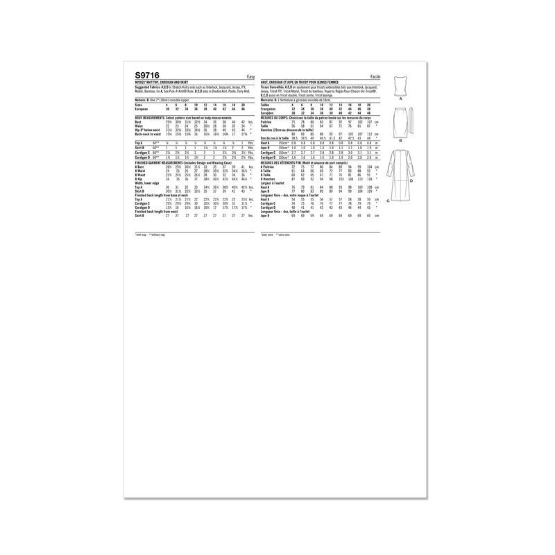 Le patron de couture Simplicity 9716 offre un ensemble polyvalent composé d'un haut en tricot, d'un cardigan et d'une jupe, parfait pour toutes les occasions. Le cardigan, disponible en deux longueurs, s'accompagne d'un haut sans manches facile à enfiler et d'une jupe slim dotée d'une fermeture éclair et d'une ceinture à nouer. Conçu spécifiquement pour les tissus extensibles en tricot, ce patron est classé facile, le rendant accessible aux couturiers de tous niveaux qui souhaitent créer une tenue confortable et élégante. Ce set est idéal pour créer des pièces personnalisées, offrant confort et style dans votre garde-robe quotidienne.