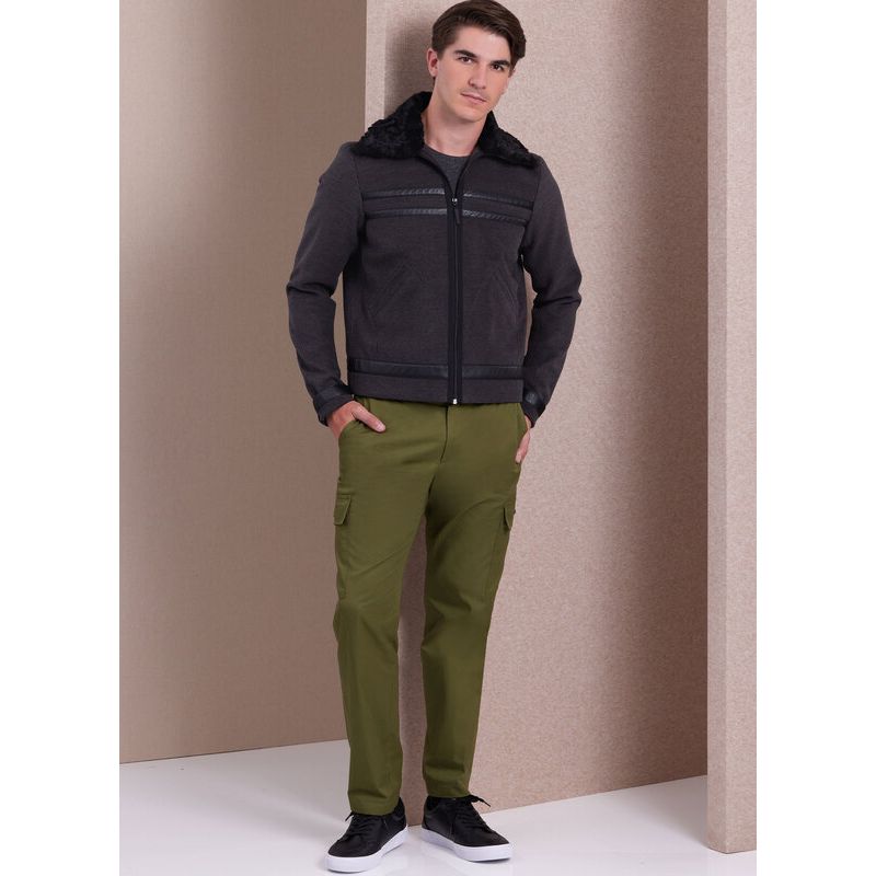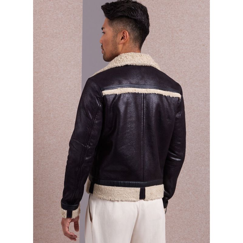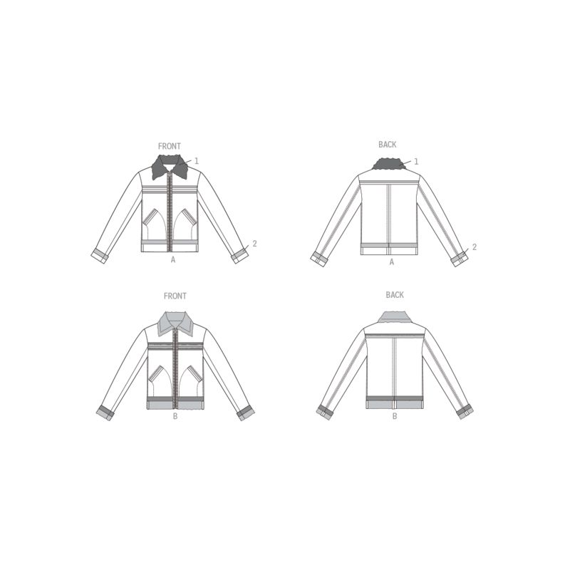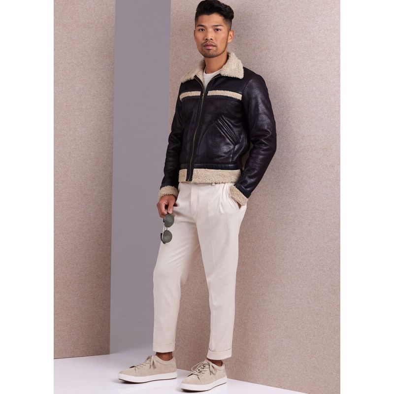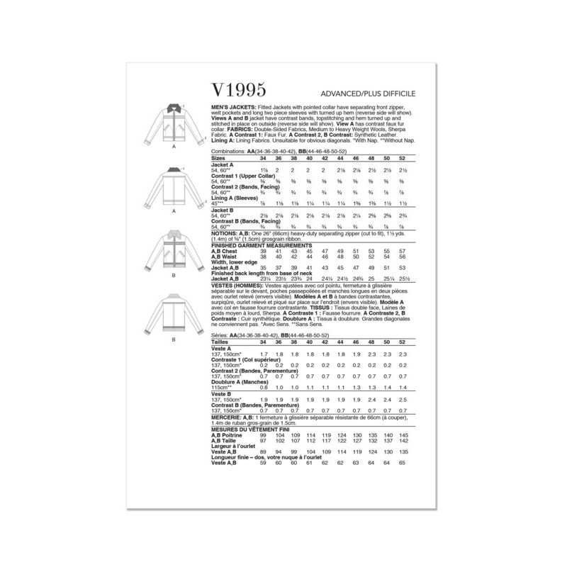 Le patron Vogue 1995 présente une conception de vestes pour hommes ajustées, dotées d'un col pointu, d'une fermeture éclair séparable à l'avant, de poches passepoilées et de manches longues en deux pièces avec ourlet retroussé (laissant apparaître le revers). Les modèles A et B se distinguent par des bandes contrastées, des surpiqûres et un ourlet retroussé et cousu à l'extérieur (montrant également le revers). Le modèle A est en outre agrémenté d'un col en fausse fourrure contrastant. Cette pièce avancée est idéale pour les saisons plus froides.