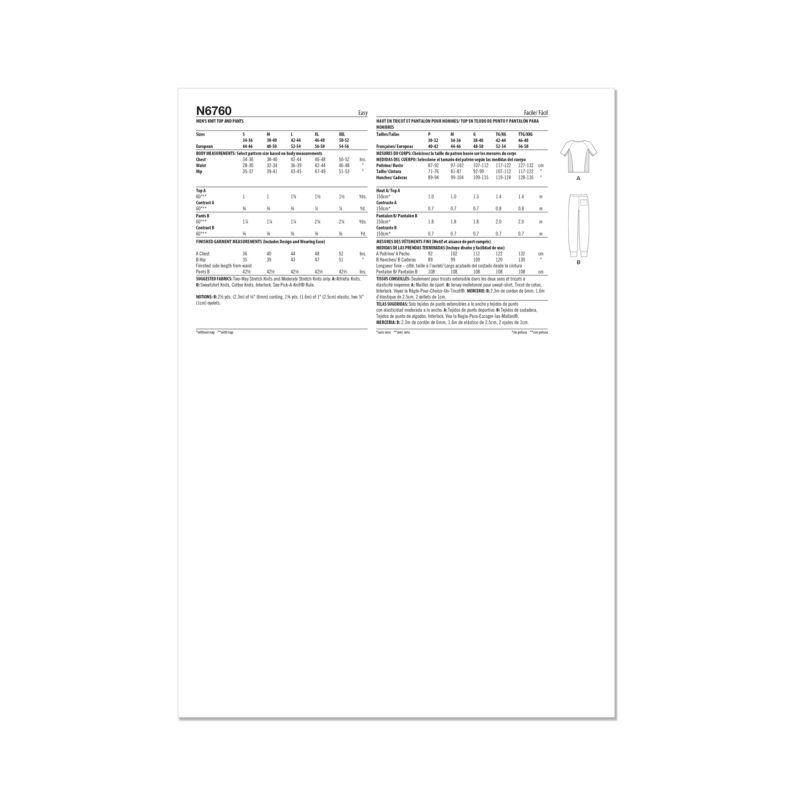 Découvrez le patron de couture New Look 6760, idéal pour créer un ensemble décontracté et confortable comprenant un haut en maille et un pantalon de jogging pour hommes. Ce modèle propose un haut à enfiler avec des manches raglan courtes et des panneaux latéraux contrastés, ainsi qu'un pantalon de jogging à enfiler doté de poches, de bandes aux chevilles et d'une taille élastiquée avec cordon de serrage.
