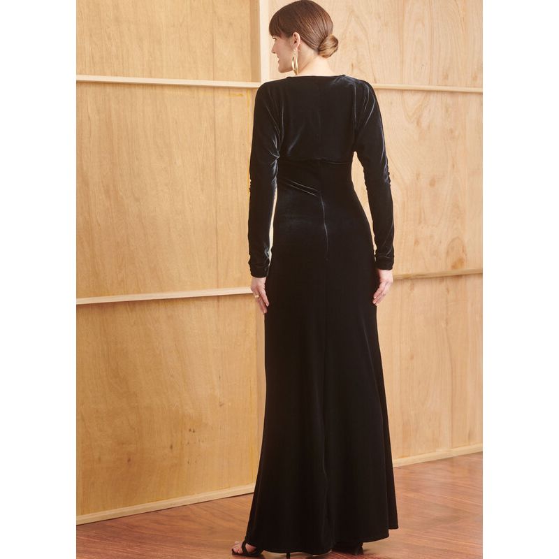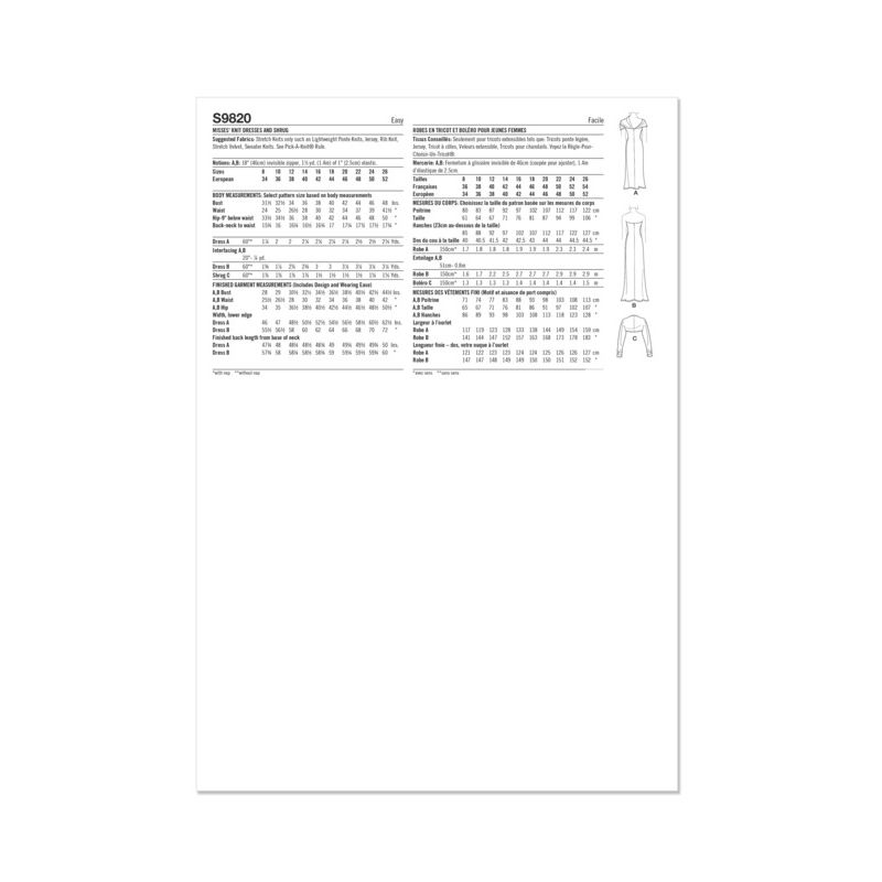 Le patron Simplicity 9820 vous permet de réaliser deux styles de robes en maille, accompagnées d’un boléro élégant. Ce modèle propose une robe semi-ajustée disponible en deux longueurs, avec un ourlet légèrement évasé et une fermeture à glissière invisible à l'arrière. La version A est une robe mi-longue avec un décolleté drapé et des épaules dénudées, tandis que la version B offre une robe longue et sans bretelles, idéale pour une tenue sophistiquée. Le boléro assorti se distingue par un nœud au centre, ajoutant une touche de charme à l'ensemble. Ce patron polyvalent est parfait pour créer des tenues élégantes, adaptées aux occasions spéciales ou à une soirée décontractée.