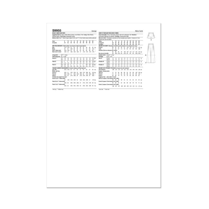 Découvrez le patron Simplicity 9955, conçu pour créer des shorts et pantalons élégants et confortables pour femmes. Ce modèle propose des pièces à plis avec des poches insérées dans les coutures latérales, une fermeture à glissière frontale avec bouton, et une coupe à jambes larges. La vue B présente un pantalon court, tandis que la vue C offre une version longue, vous permettant de varier les styles selon vos envies et les occasions.