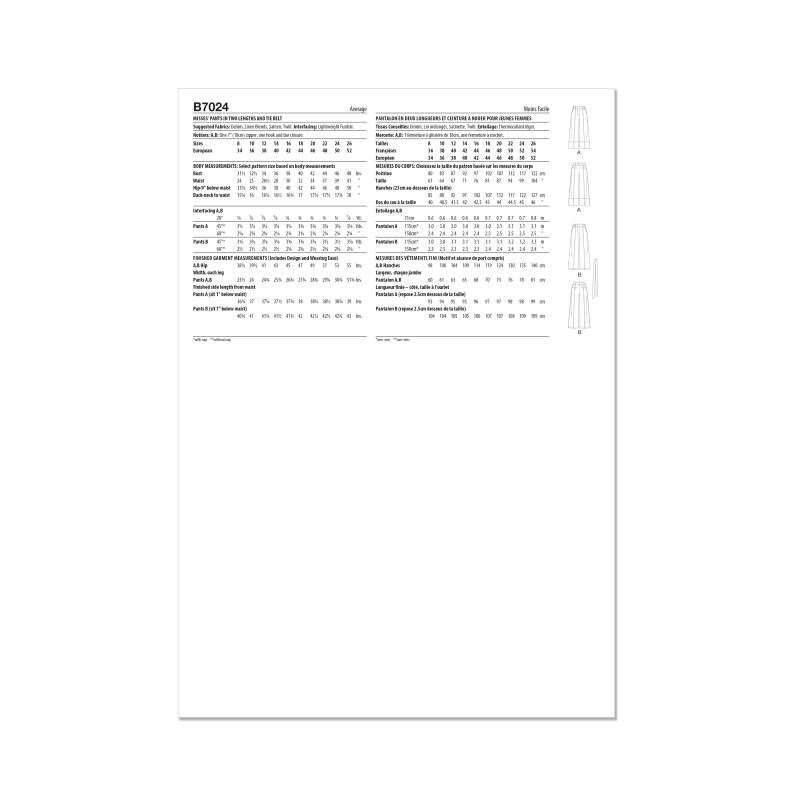 Le patron Butterick n°7024 vous propose deux variantes, chacune présentant ses propres caractéristiques uniques pour répondre parfaitement à vos envies mode. Le modèle A se distingue par son large ourlet piqué, un détail élégant qui apporte une finition impeccable et structurée à votre pantalon. Ce modèle sera parfait pour celles qui apprécient les tenues classiques, adaptées aussi bien aux occasions formelles qu’aux sorties quotidiennes. Le modèle B, quant à lui, est agrémenté d’une ceinture assortie, ajoutant une touche de sophistication supplémentaire et soulignant subtilement la taille pour une silhouette harmonieuse et élégante.