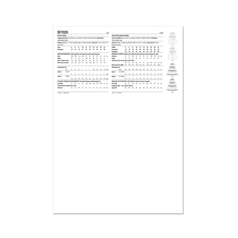 Donnez vie à vos envies mode grâce au patron Butterick n°7025, conçu spécialement pour réaliser de sublimes jupes amples à volants, parfaites pour sublimer votre silhouette avec élégance et légèreté. Ce modèle propose une coupe fluide et généreuse, idéalement pensée pour un confort absolu tout en mettant en valeur votre féminité. Les volants apportent un mouvement délicat et aérien à chaque pas, transformant votre tenue en une véritable invitation à la liberté et à l'élégance. La fermeture à glissière invisible située sur le côté garantit une finition discrète et soignée, tandis que la ceinture à agrafe offre une touche raffinée pour marquer subtilement la taille.