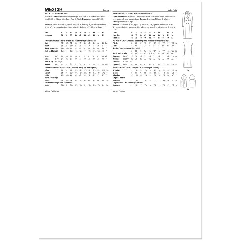 Patron KnowMe 2139.K5 (36-44) - Manteau croisé & insert capuche