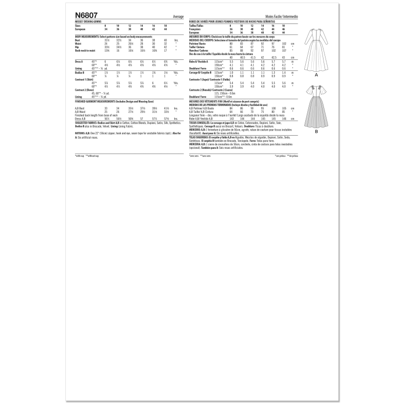 Découvrez le patron New Look n°6807 pour créer une robe de soirée longue qui laissera une empreinte élégante. Le patron propose deux variantes : la version A avec un décolleté carré, une coupe ajustée au buste avec coutures princesse, des manches longues froncées et une jupe ample plissée avec pli creux à l’avant ; et la version B avec col en V, darts au buste, manches évasées déjà au coude, jupe contrastée et jolies nœuds aux épaules. Vous imaginez déjà le moment où cette robe prendra vie. Grâce à cette structure raffinée, vous vous appropriez une création qui incarne la distinction et l’assurance. Une fois la coupe choisie, chaque étape vous rapproche de l’accomplissement de votre projet couture, et le sentiment d’aboutissement se fait instantanément présent. Imaginez : cette robe faite de vos mains, parfaitement ajustée, prête à sublimer l’instant où vous la porterez.
